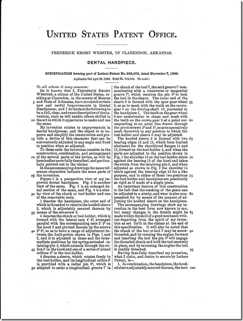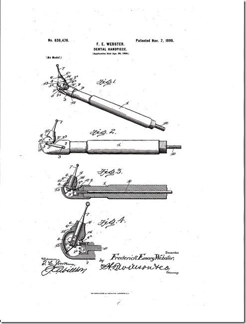 My uncle (Frederick's grandson) alerted me to this fact. He did a search on Google.com for Frederick Emory Webster and found a patent that was awarded to Frederick in 1899. Frederick invented improvements to a Dental Handpiece. Thank you to my uncle for passing this interesting information on to me!
